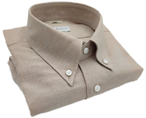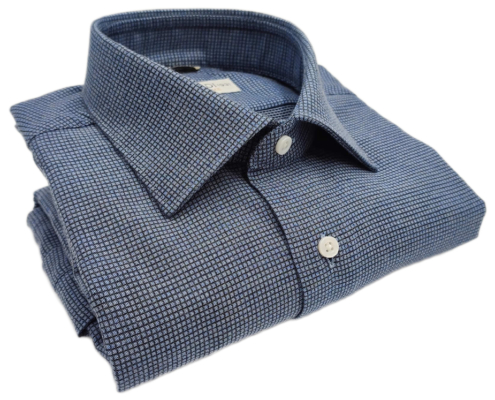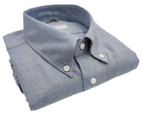 Descrizione: camicia sartoriale con bottoni di madreperla, impuntura al collo realizzata a 3 mm, mosca semi-sartoriale